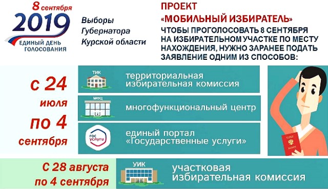 Эта возможность адресована в первую очередь людям, которые зарегистрированы в одном месте, а живут в другом. Механизмом «Мобильный избиратель» также смогут воспользоваться командированные, отдыхающие, студенты, которые учатся вдали от дома. Чтобы проголосовать по месту нахождения на выборах Губернатора Курской области, избирателю нужно заранее подать заявление о том, чтобы его включили в список избирателей на удобном для него избирательном участке. Заявление необходимо подать одним из предложенных способов по 4 сентября: в любой территориальной избирательной комиссии; в любой участковой избирательной комиссии; в любом филиале (офисе) многофункционального центра предоставления государственных и муниципальных услуг (МФЦ «Мои документы»); а также через портал «Госуслуги», на котором в личном кабинете создана специальная страница для пользователей «Мои выборы».